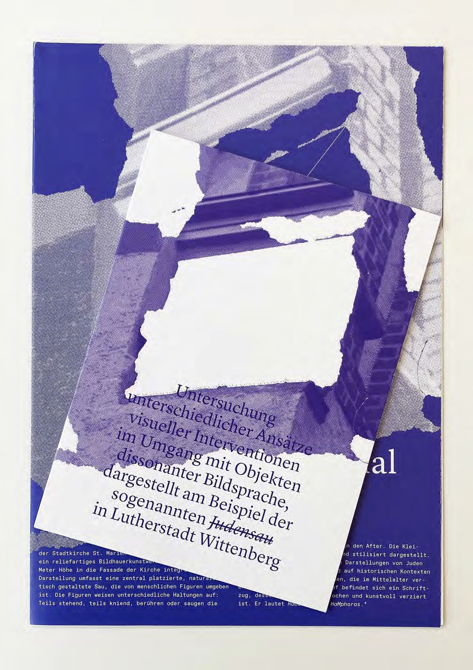 Gerade in Zeiten eines gesellschaftlich immer präsenter werdenden Rechtsrucks und Antisemitismus ist der Umgang mit dem medial breit diskutierten Schmährelief aus unserer Sicht neu zu diskutieren. Genau dort soll das vorliegende Projekt anknüpfen: In zwei Publikationen möchten wir uns vielschichtig den aufgeworfenen Fragen und dem öffentlichen, verhärtet erscheinenden Diskurs annähern. Durch ein Faltplakat gelangt der:die Leser:in über eine einleitende, historische Einordnung mit jedem Auffalten zu einer weiteren Informations- und Kontextualisierungsebene, bevor sich ein „Runder Gesprächstisch“ eröffnet. Es wird eine multiperspektivische, fiktive Diskussion zwischen Akteur:innen aus Kirche, Architekturgeschichte, Politik und Gesellschaft inszeniert, welche sich in dieser Konstellation nie begegnet sind, sondern zuvor in Einzelinterviews befragt wurden. Das Begleitheft beschäftigt sich mit praxisnahen und experimentellen künstlerischen Interventionen und Verhüllungsmethoden am Beispiel der Schmähplastik in Wittenberg. Mithilfe eines Glossars erhält der:die Leser:in einen Überblick über die wichtigsten Begriffe und Schlüsselwörter in der Auseinandersetzung mit dem Themenfeld. Zudem soll ein gestalterischer Umgang mit der Schmähplastik offeriert werden, welcher Aufmerksamkeit erregt, ohne die Schmähplastik zu reproduzieren. Mit den Publikationen soll dem teilweise verhärteten Diskurs im Umgang mit der antisemitischen Schmähplastik ein neuer Raum gegeben werden, der die Möglichkeit einer nachhaltigen, facettenreichen Debatte eröffnet und die Hoffnung birgt, sich in der Realität fortzusetzen.